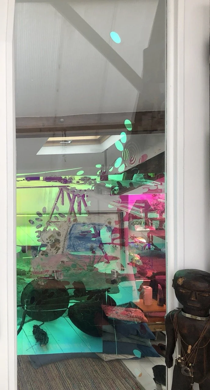 The south-facing window is, in a way, an update of interventions done at the priory where I was gluing oval glass on the window panel; it features an outline oval made with silicone without any actual glass adhered to it, along with decorative film ovals floating around.