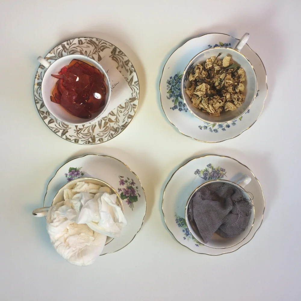Glass, dry chrysanthemum, tears, fabric, paper, time, Julios cups